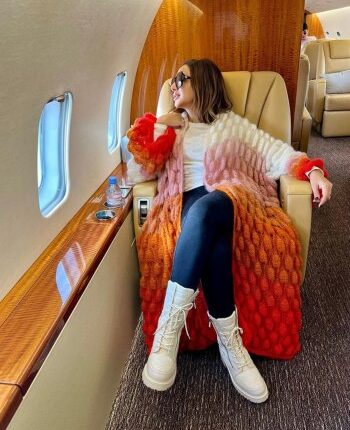 ولبست حذاء رياضيًا مع نظارات شمسية وبدت وهي تنظر من شباك الطائرة الى الخارج.