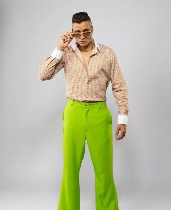 وارتدى حسن قميصاً منقطاً بلونين أبيض وأخضر وبرتقالي ونسقها مع بنطلون فوسفوري صادم للغاية ويتطلب جرأة كبيرة حتى يرتديه اي رجل.