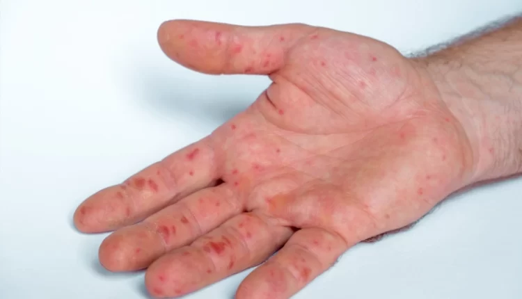 بينما أعراضه تتمثل بالطفح الجلدي وتهيج الجلد والجفاف، التعب وآلام المفاصل وتشنجات المعدة والغثيان والقيء والإسهال والسعال والعطس.