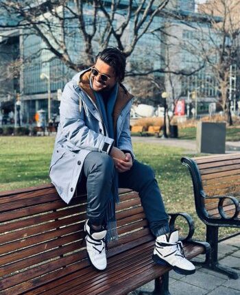ونسق زيتون الشال بلون الجاكيت نفسها لكن بدرجة داكنة أكثر، وانتعل حذاء رياضياً وضع على وجهه نظارات شمسية لتقيه أشعة الشمس.