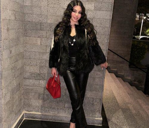 ووضعت وهبي جاكيت من الفرو، وأكملت الإطلالة بحذاء أنيق بكعب عالٍ، وأمسكت بيدها حقيبة حمراء.